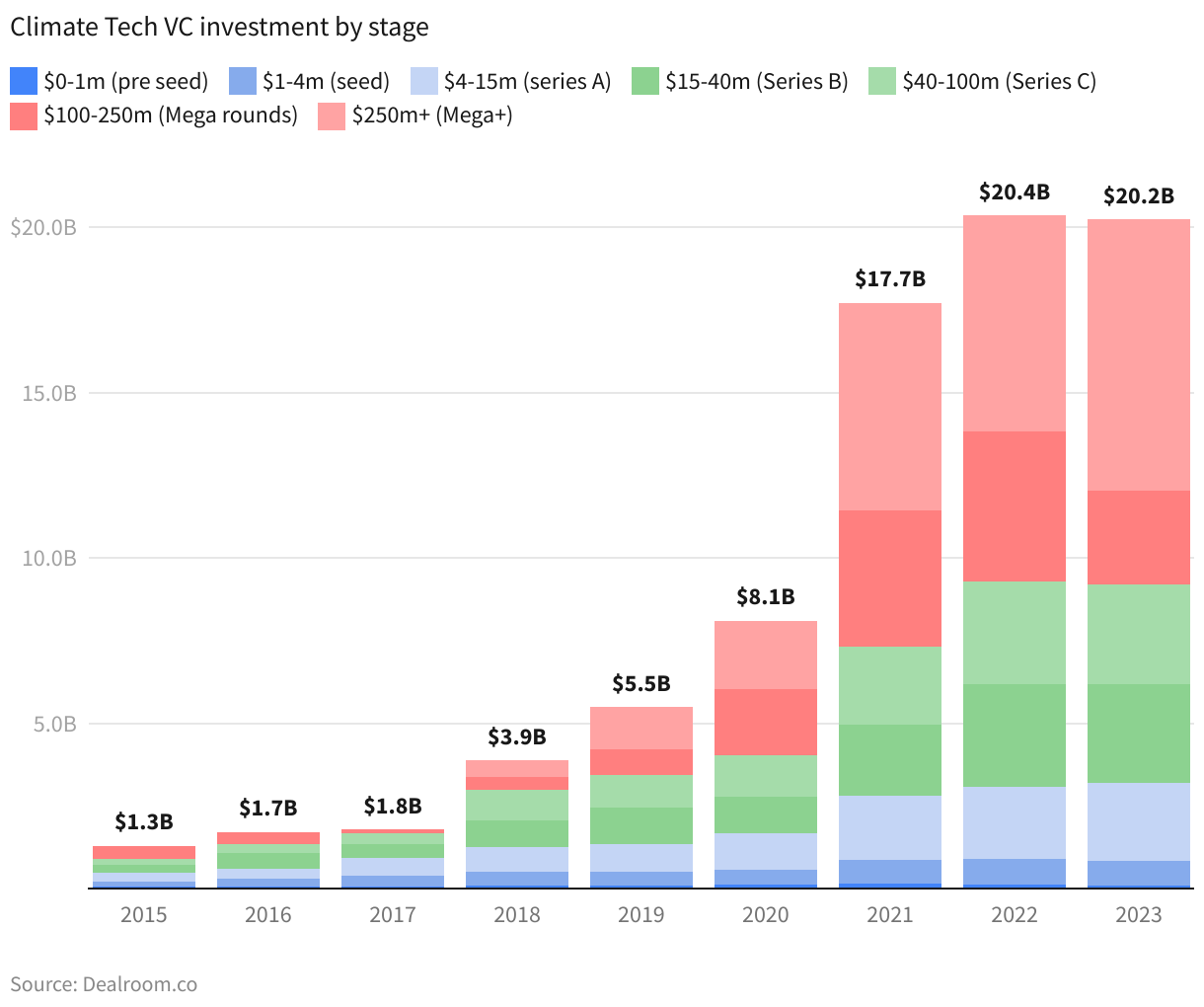 En 2023, les startups de la Climate Tech ont levé 20 milliards d’euros en Europe, dont près de 3 en France. C’est une bonne dynamique, mais encore insuffisante. L’UE estime en effet que 8 000 milliards d’euros d’investissement seront nécessaires à l’horizon 2030 pour soutenir la transition écologique.