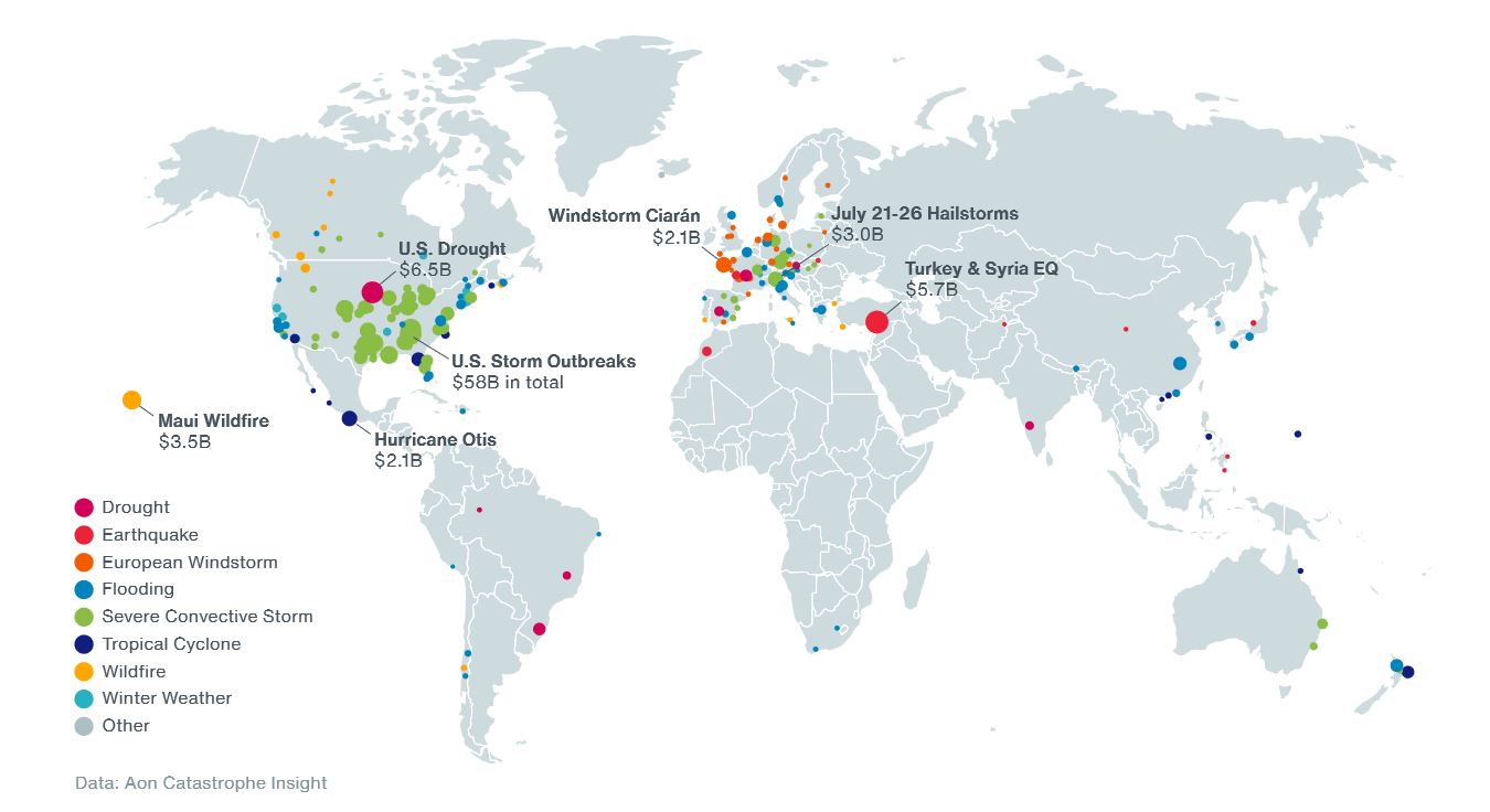 AON, dans un rapport dense de près de 120 pages, dresse un état des lieux extrêmement détaillé de la situation. Premiers chiffres à retenir : près de 400 catastrophes naturelles ont occasionné 380 milliards de dollars de pertes économiques dans le monde en 2023.